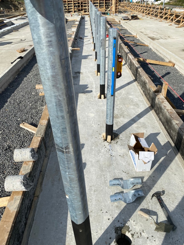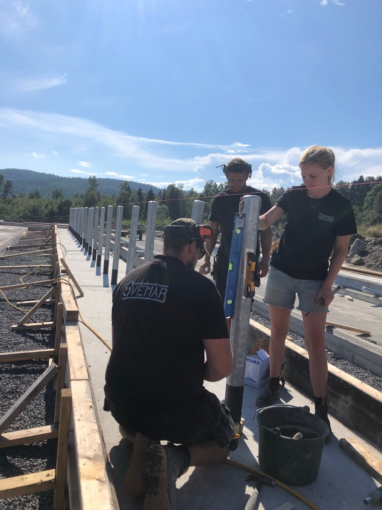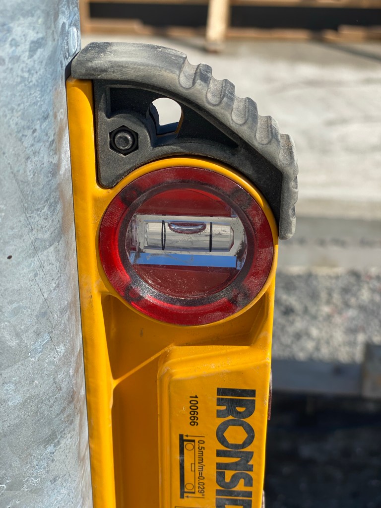 Det tar sin lilla tid att få på plats en stolpe. Det är många parametrar som ska stämma in… Vattenpass på alla sidor så den står rakt, den ska stå i linje med de andra och höjden ska vara rätt! Och vridningen ska vara rak också!