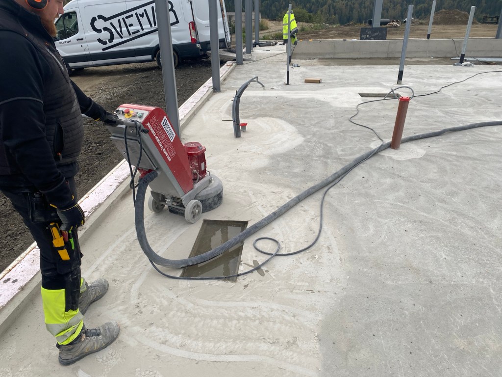 Vi har funderat länge på vad vi ska behandla foderbord, golv i robotrum och tankrum osv med. Det finns lite olika beläggningar man kan lägga på. För betong slits och det blir ohygieniskt på foderbord och robotrum. Marren och sitt företag Svemar slipar betongen och behandlar den sedan med ett medel som stöter bort smuts, fett och olja. Det går liksom in i betongen och inte någon som ligger ovanpå och lossnar! Det här behandlas ofta industrigolv med, butiker, garage och golv som måste stå ut för väldigt hög påfrestning. Perfekt tänkte vi! Kanske något som håller bra och inte släpper efter ett par år…