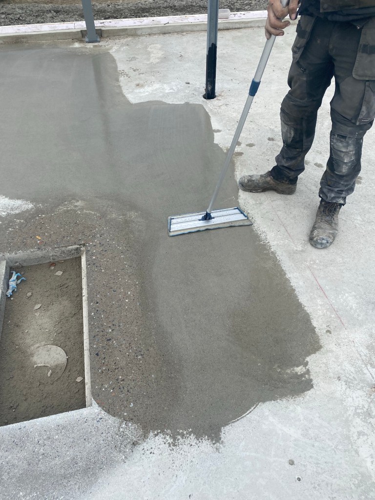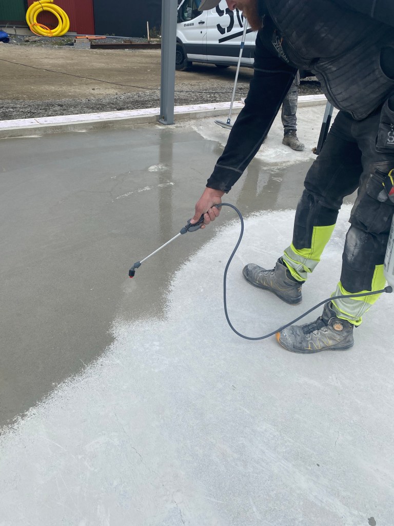 Kemikalierna sprayas på ett tunnt lager och stryks ut. Denna första behandling för att betongen härdar ännu lite mer och blir ännu hårdare kan man säga.