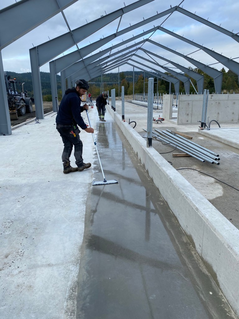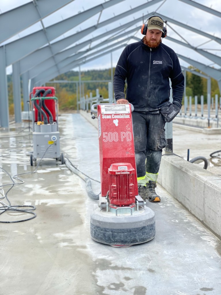 Betongen ser fortfarande ut som betong men är len och blank. Vi gjorde inte lika finslipat i tank- och robotrum då det blir halt ju finare man slipar. Men foderbordet får ju gärna vara finslipat så det går lätt att sopa och hålla rent och där går man ju inte och halkar runt heller.