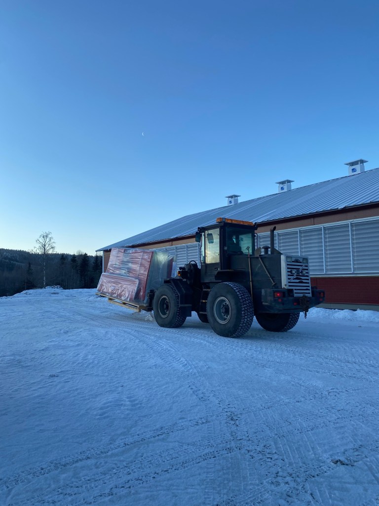 Såå nervös när den skulle ställas in! Fy sjutton om den skulle falla i backen…! Men Anders från NordingråBygg bar in den så ordentligt så! Vår hjullastare var lite för liten.