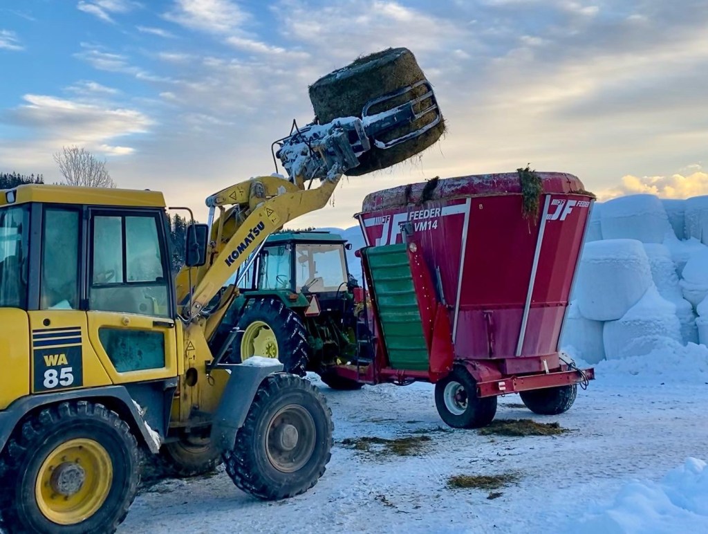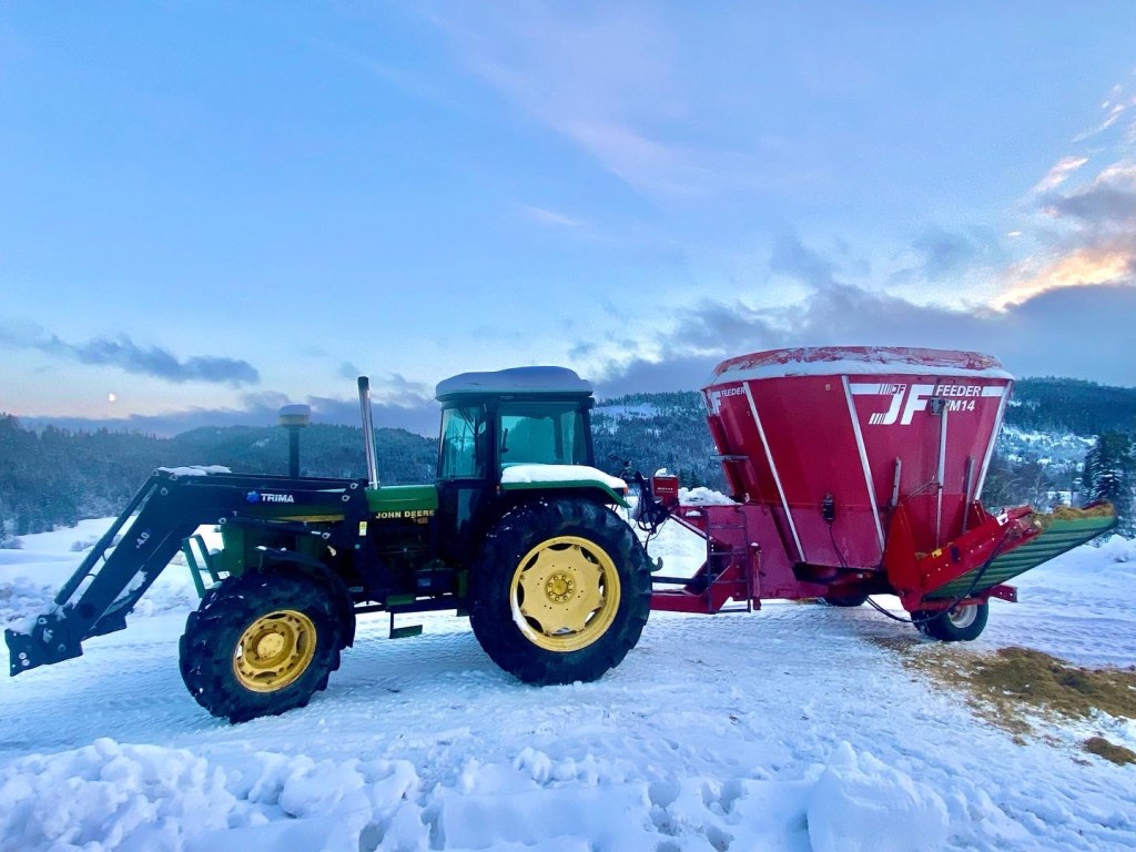 Här är vårt utfodringssystem! JF mixervagn 14kubik och vår Brum-Brum John Deere 3650. Detta hade vi alltså på gården så vi tänker att vi börjar så. Då sparar vi in en slant i själva bygginvesteringen på att slippa ett nytt fodersystem direkt och så får vi ett körbart foderbord även för framtiden. Plan B ni vet. Har man en automatiserad utfodring så vill vi ha en plan B att kunna få in foder på ett lätt sätt. Bara det då finns en traktor så kan man köra in mat till djuren om det skulle krångla!