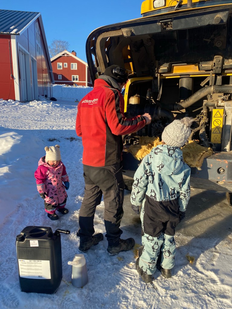 Hjullastaren började krångla lite förra veckan till att helt plötsligt inte alls gå igång. Den som går här på gården prick varje dag. Den blandar vi foder med och skrapar och gör ungdjursladugården varje dag.