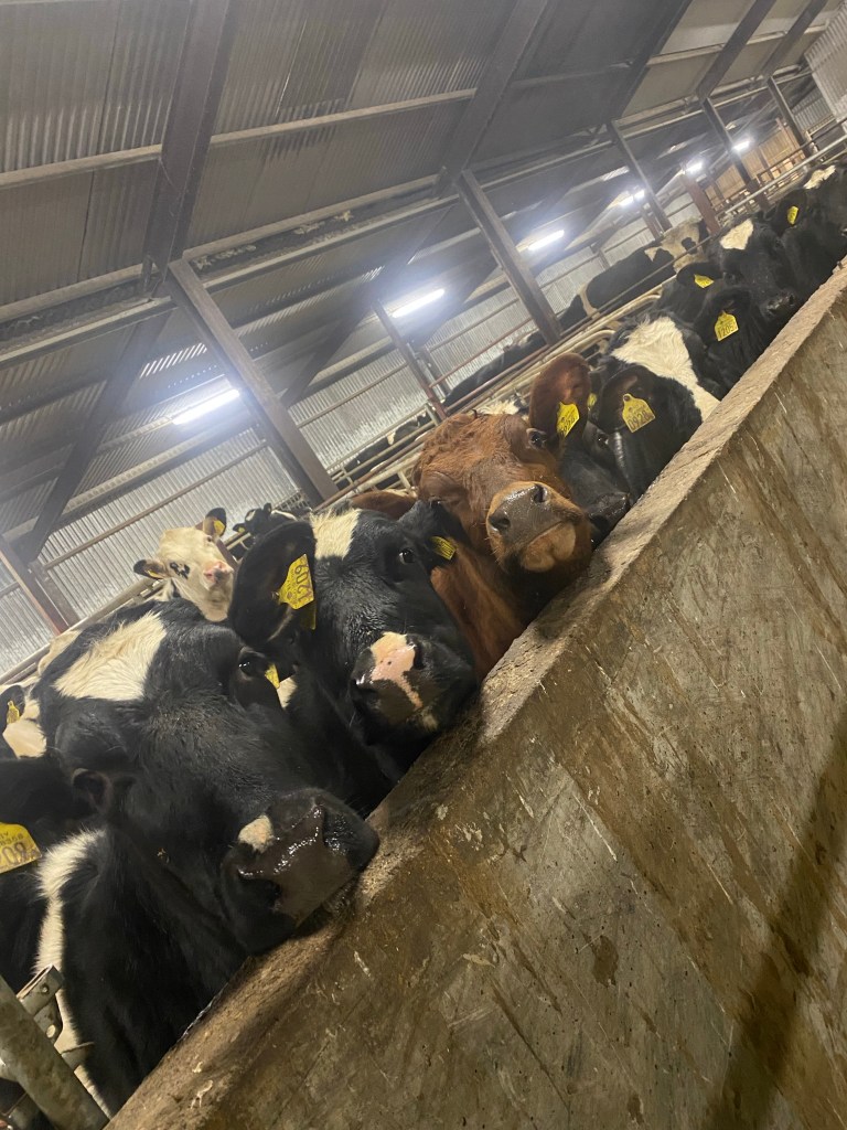 Skrapa rent alla gångar, ströa upp till småkvigorna och utfodra och göra en ströblandning till liggbåsen i nya ladugården.
