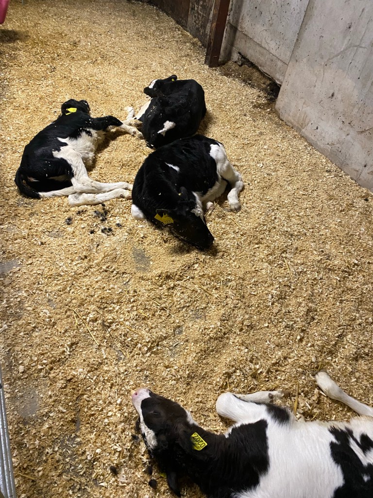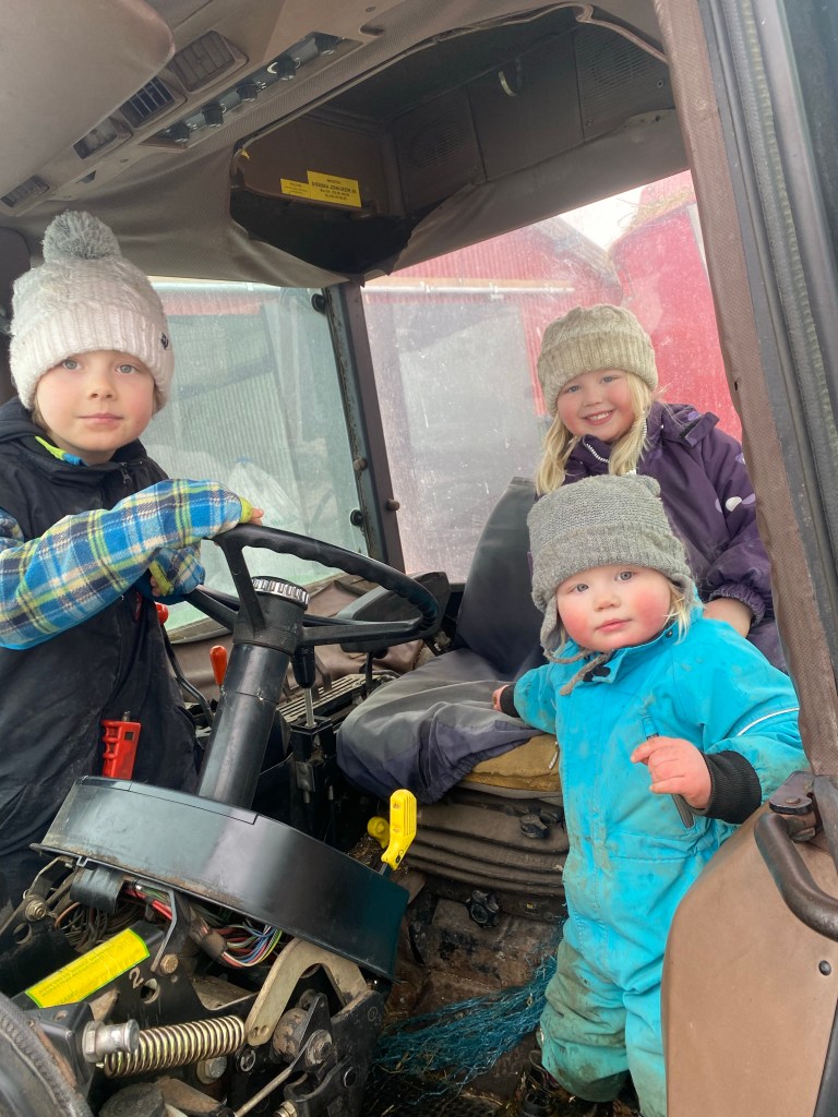 Nu har jag nattat trion. Jag ska ner en sväng till och eventuellt ge kossan lite kalk och köra ut lite mera foder inför natten.
