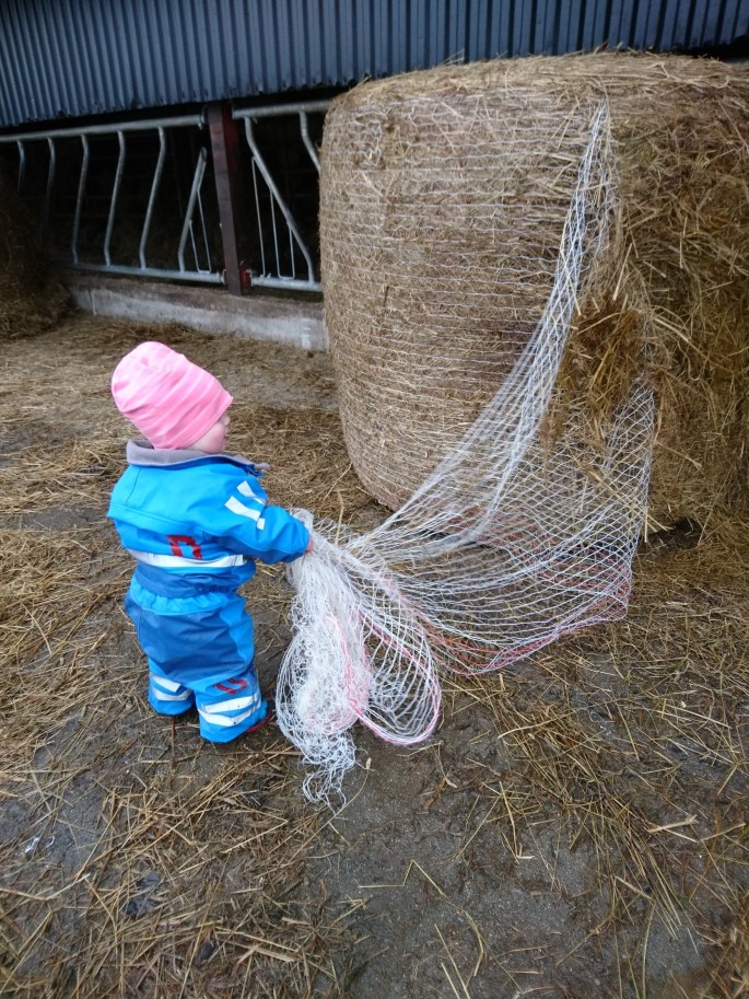 Och det gör vi vintertid dagligen eller möjligtvis varannan dag beroende hur kallt det är. Är det väldigt kallt så håller sig bäddarna fräscha längre och det behövs mindre halm. Men det är ganska fort gjort. På 1,5 – 2h har man skrapat och halmat. Och utfodringen är inte varje dag. Man ställer ut ett gäng balar som de får mumsa på, ser bara till att trycka/skotta in dagligen så de når att äta. Så ett par gånger i veckan körs nya balar ut.