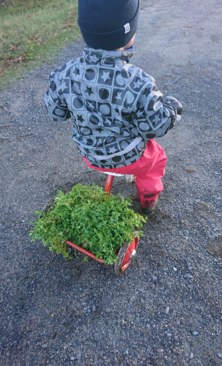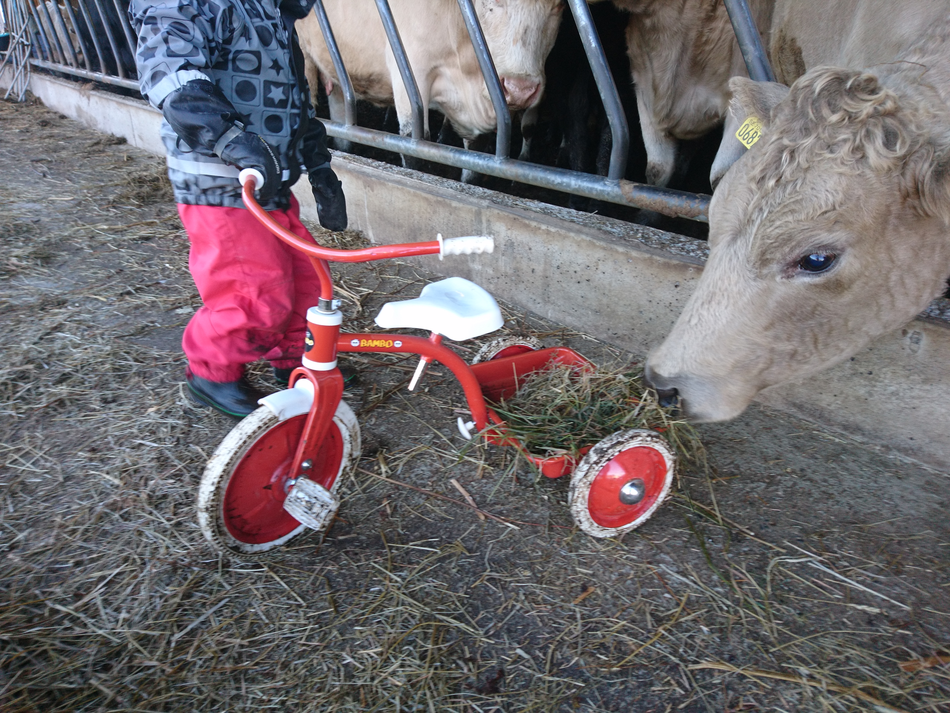 Efter Borta-jobb och förishämtning delade vi på oss och tog varsin overallunge med oss. Jag och den lilla flickan hoppade in i traktorn och körde balar till korna och Lilla P han åkte pappan på jobb, och mjölkade!