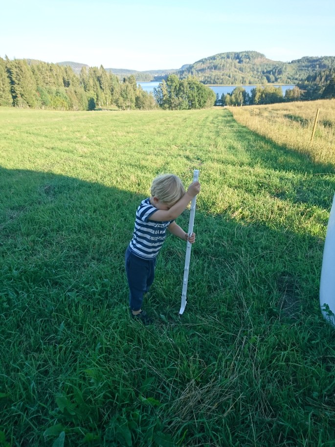 Lilla P kom ut och ville vara med men han slocknade i traktorn efter fem minuter. Han som inte sover på dagarna längre, men att hålla sig vaken i en traktor efter lunch är stört omöjligt. Älskling.