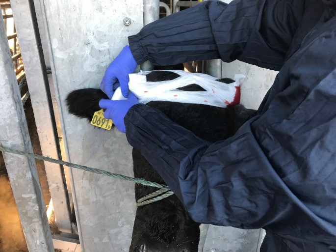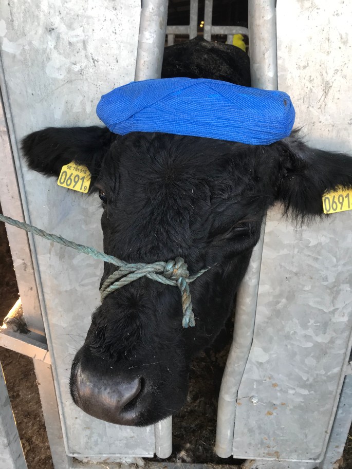 Jag lyckades tappa en bal ur rivaren men den var bara att hämta ut igen med pallgafflar och till slut så hade det halmats och skrapats överallt och tjurarna fått en ny matbal.
