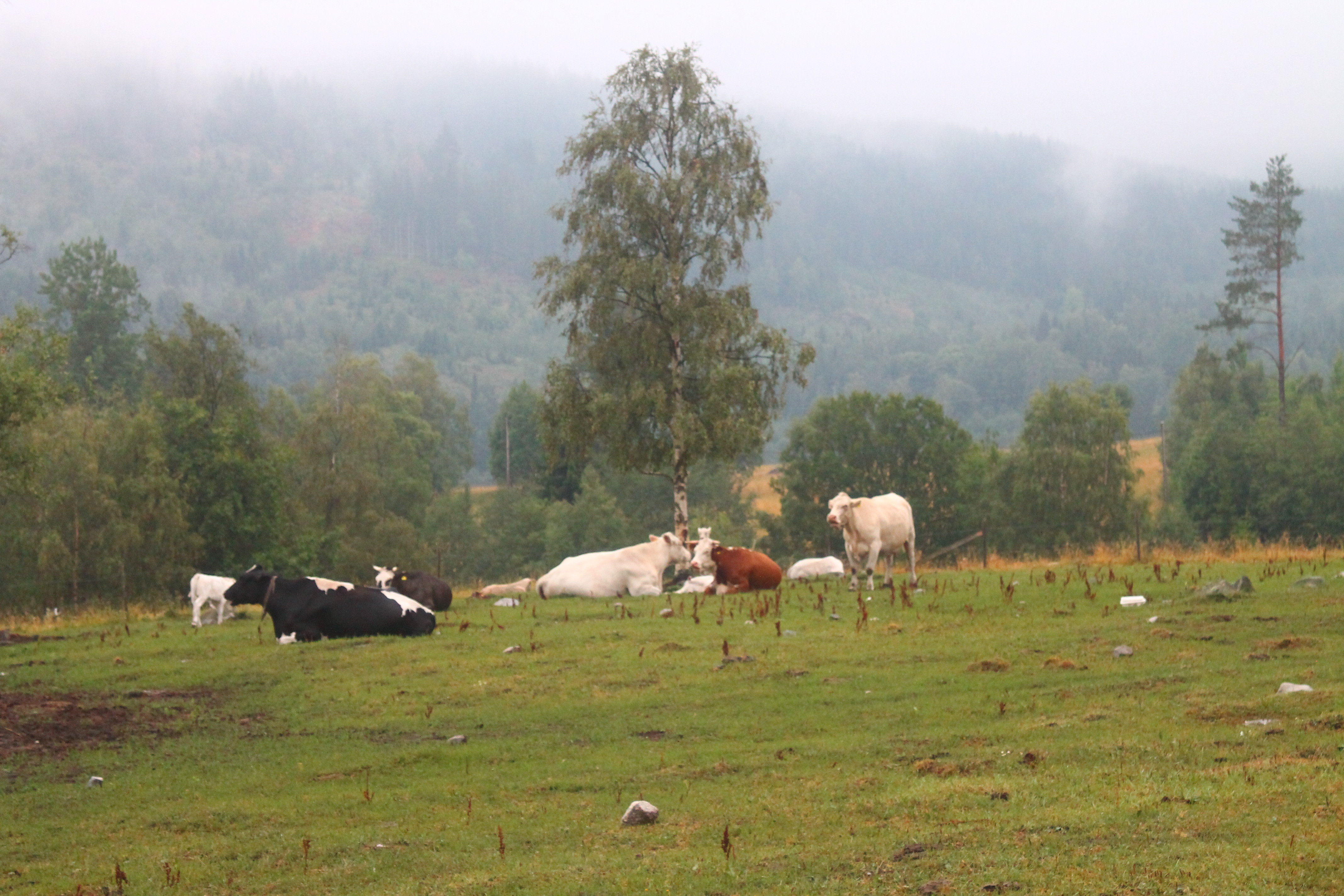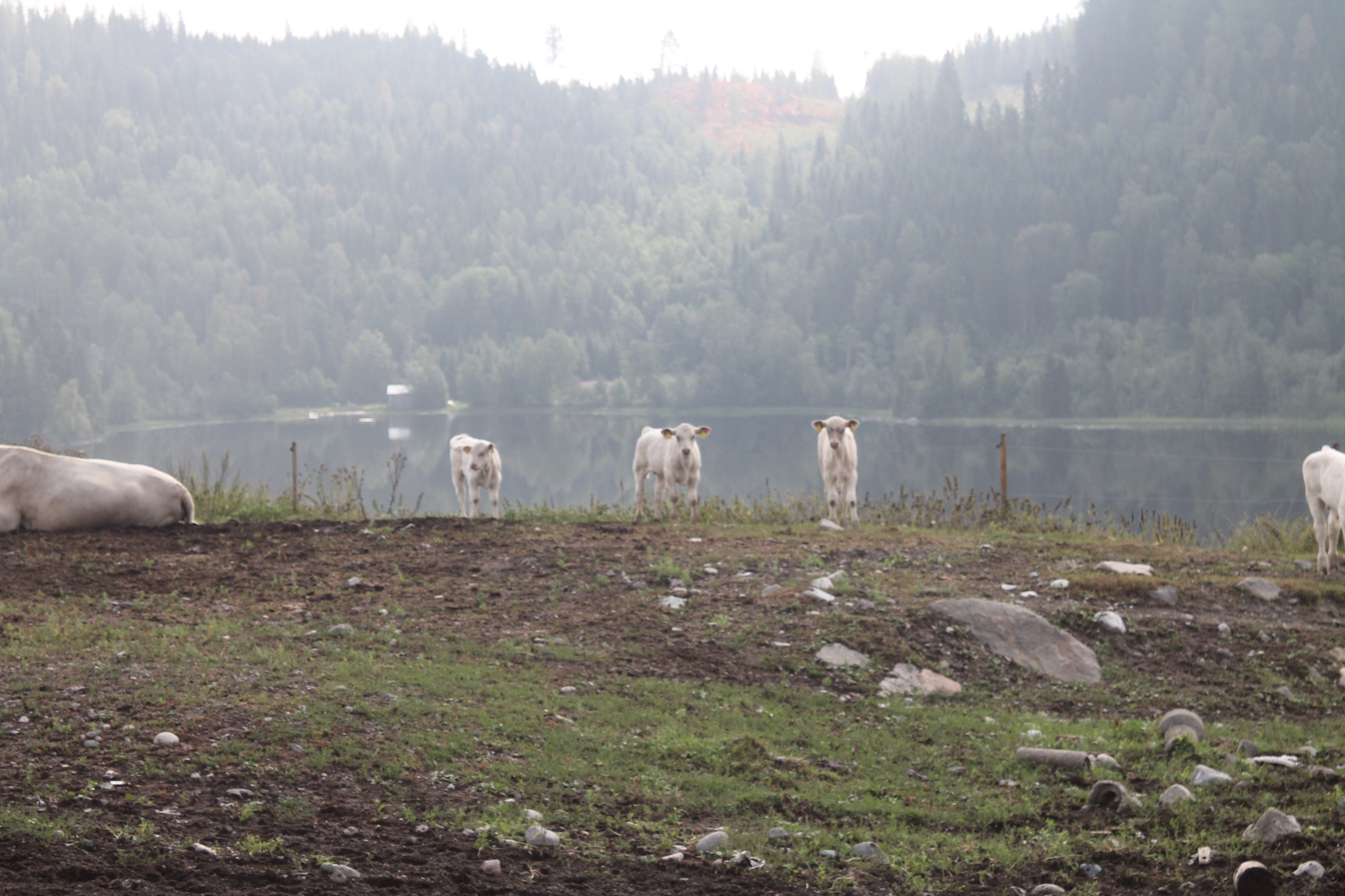 Totalt har vi drygt 80 djur nu med kor, kalvar och några tjurar. Vi har valt rasen Charolais Alla dessa går ute nu på bete nu på sommaren, förutom tjurarna som går i lagårn men kan även gå ut i en hage. Och med köttproduktion/dikor så innebär det att vi producerar just kött. Dikor betyder att man har ett gäng kor som får en kalv varje år. Den kalven föder man antingen upp till slakt eller säljer iväg som avvand 6månaders kalv till någon annan som föder upp den till slaktvikt. Så korna de går med i många, många år, får kalvar som de går med sida vid sida i minst 6 månader.