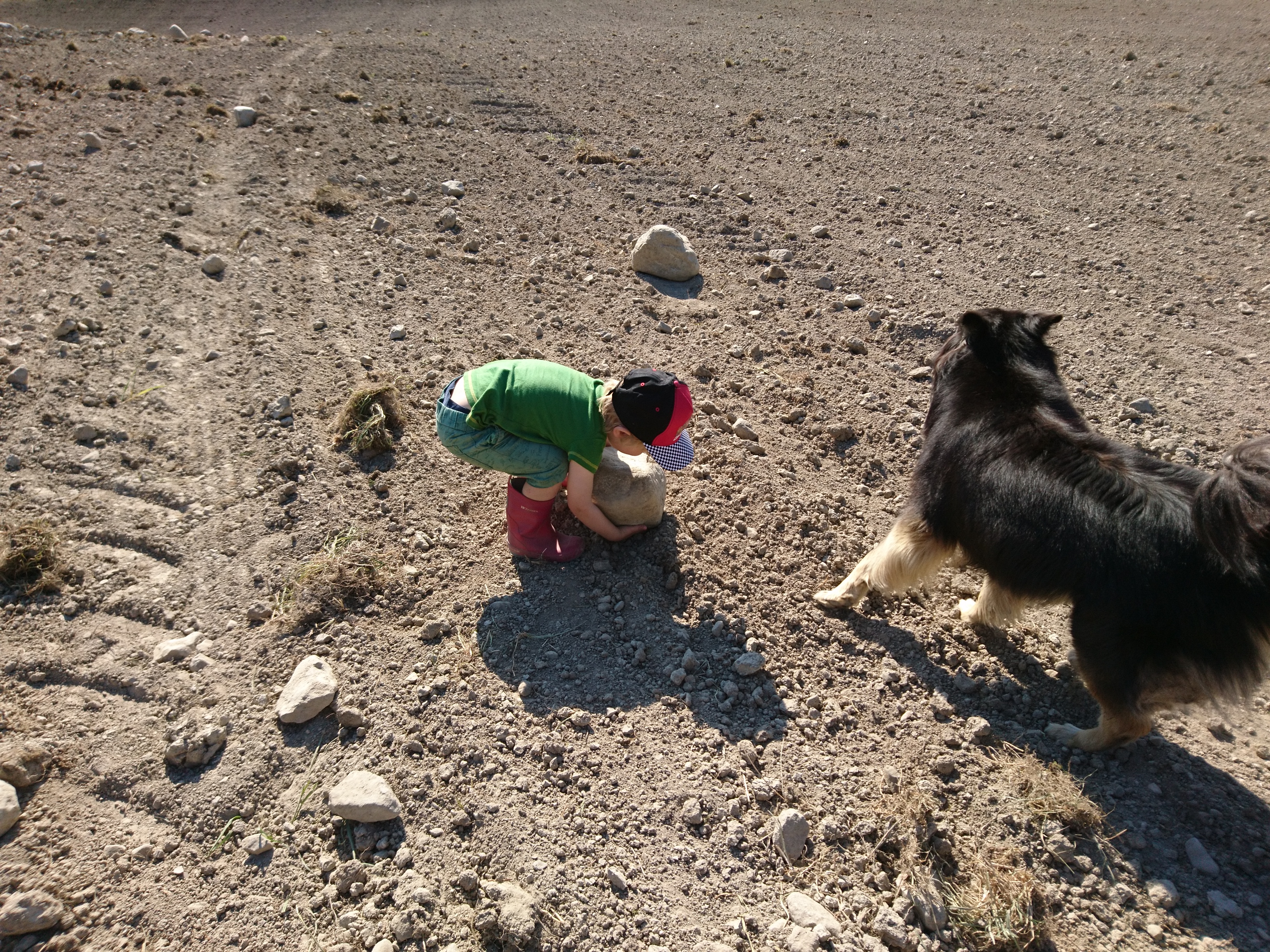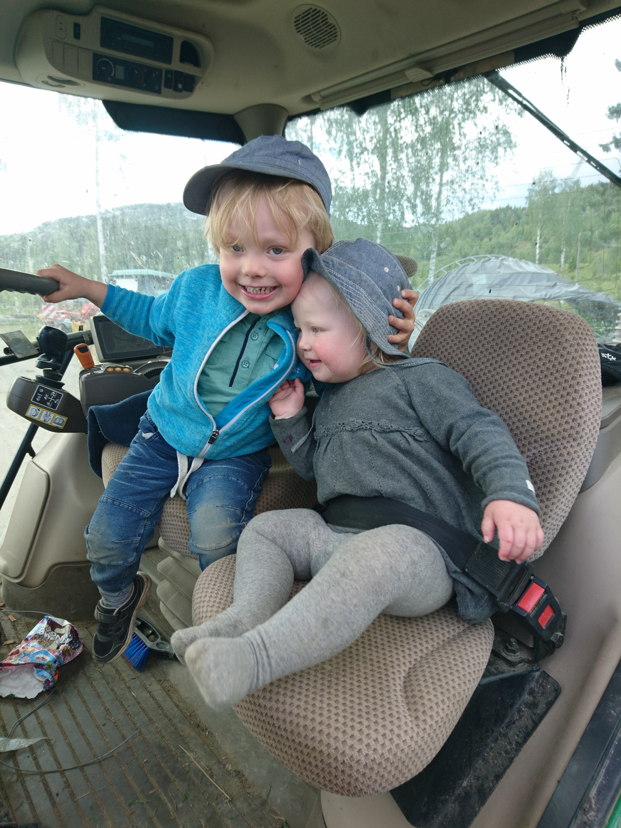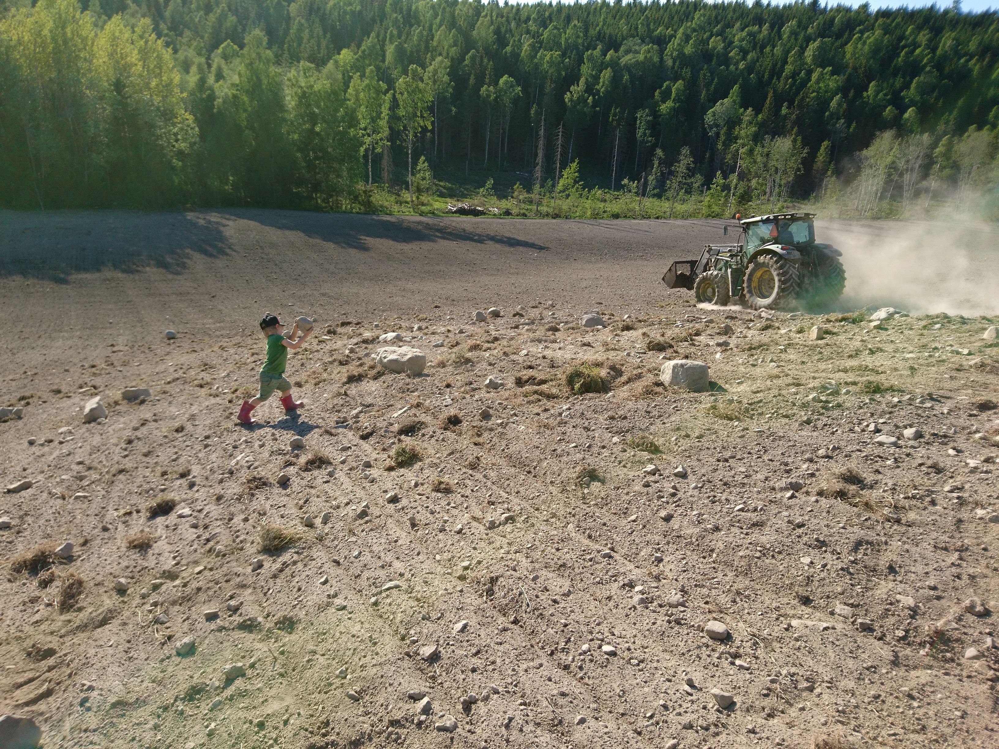 Pappa C kom hem på eftermiddagen också satte genast Brum-Brum i tjänst. Tog med två av tre barn och började välta. Det sista momentet. Köra över allt med en tung ringvält så det plattas till efter sådden.